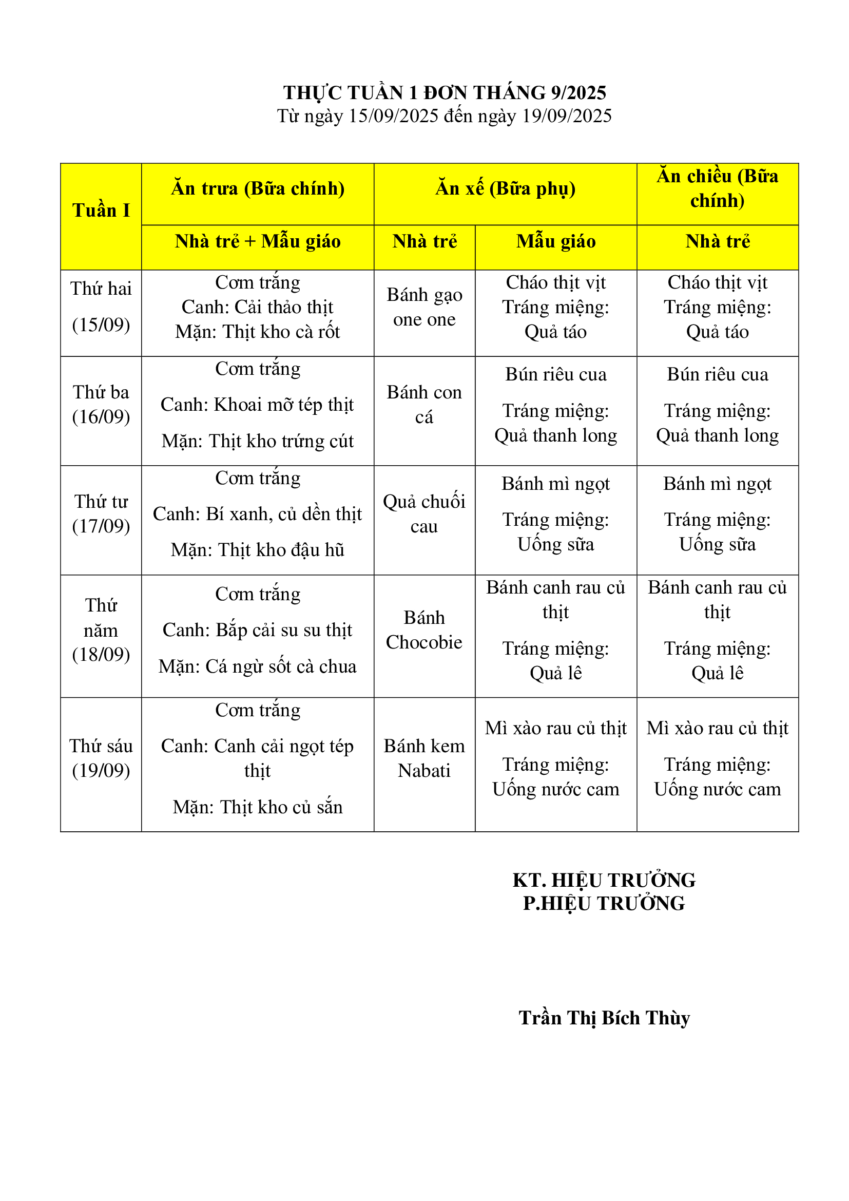 Thực đơn Tuần 1 tháng 9/2025